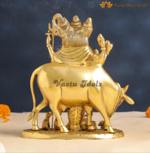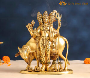 Handcrafted in fine brass, this 11-inch Dattatreya figure represents the Adi-Guru of the Adinath Sampradaya, with three heads symbolizing Brahma, Vishnu, and Shiva. Surrounded by four dogs and a cow, this intricate idol embodies the Vedas and mother earth. Made in India, it measure